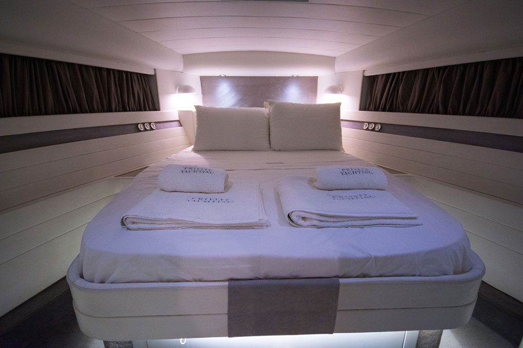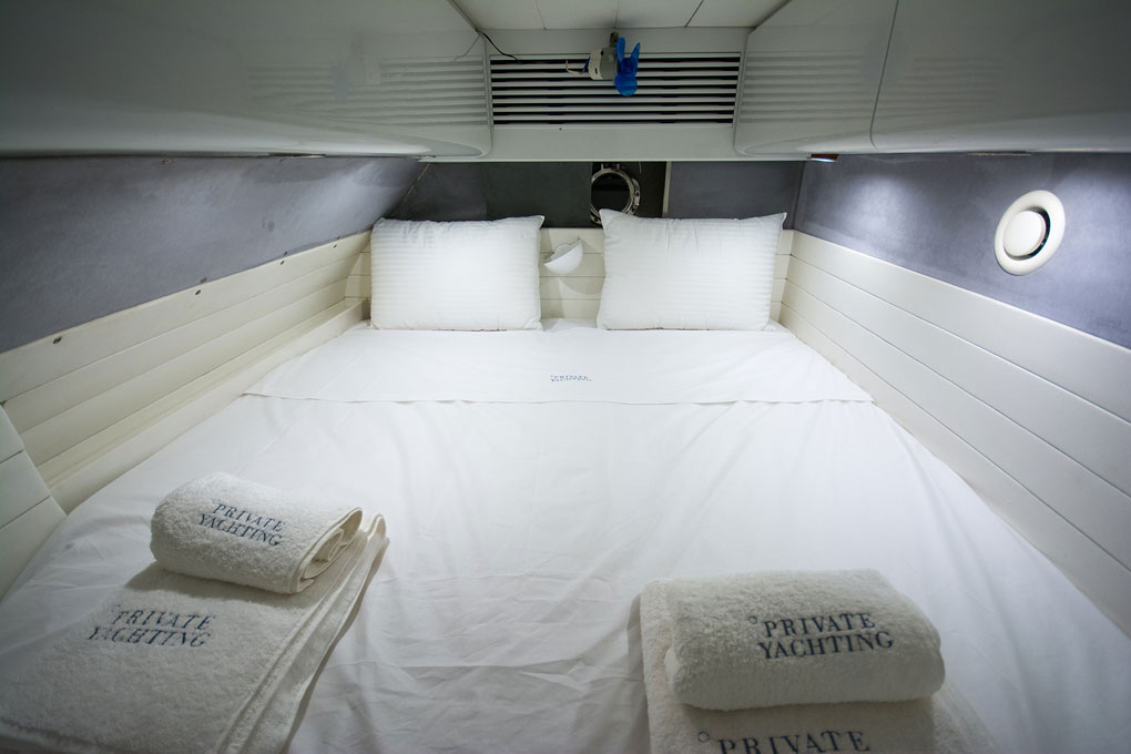 The Yacht can accommodate 10 passengers and 2 crew members for daily cruises and sleeps 2 guests. It has 2 double bed cabins (master bedroom and crew bedroom), 2 toilets and a sitting room with sofa, while outdoor areas are ideal for either sunning (on FORE DECK and BACK DECK) or relaxing in the shade on the BACK deck sitting area.