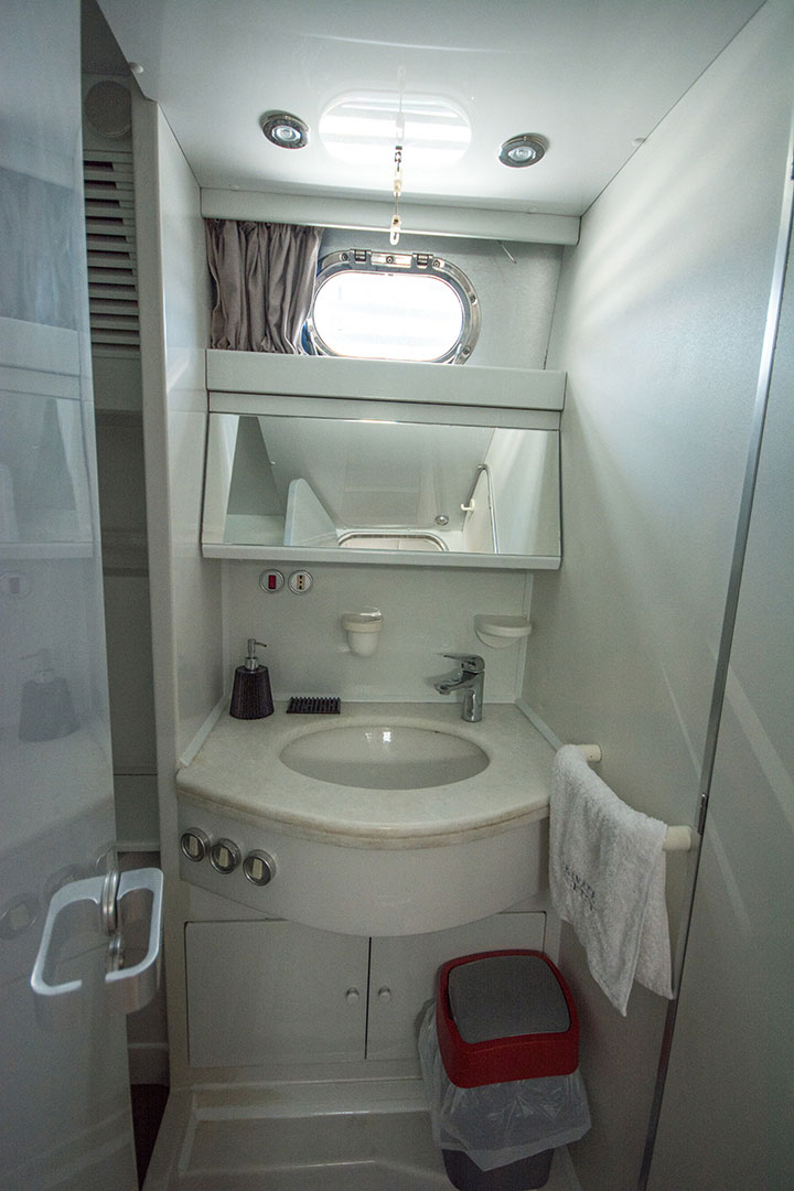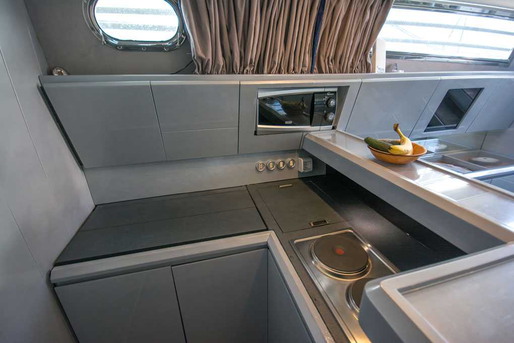 All the guests can enjoy full comfort with towels (& linen, for long cruises), A/C, water, warm water, heating, fully equipped kitchen (freezer, microwave oven, refrigerator, dishes, glasses, cutlery), deck equipment (sun tent, shower on deck, teak deck, cockpit table and sitting area for 10 passengers) and entertainment (GoPro cameras, Wi-Fi, radio/CD/MP3 player, snorkeling equipment…).
